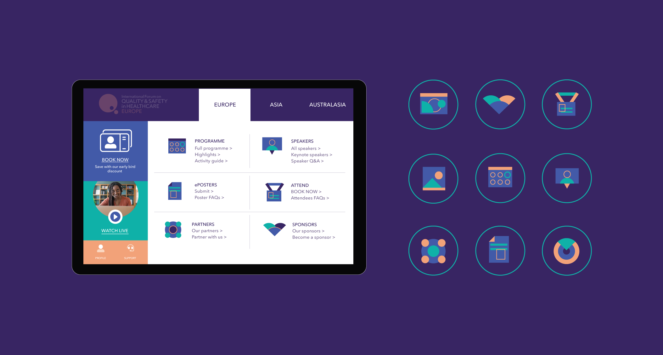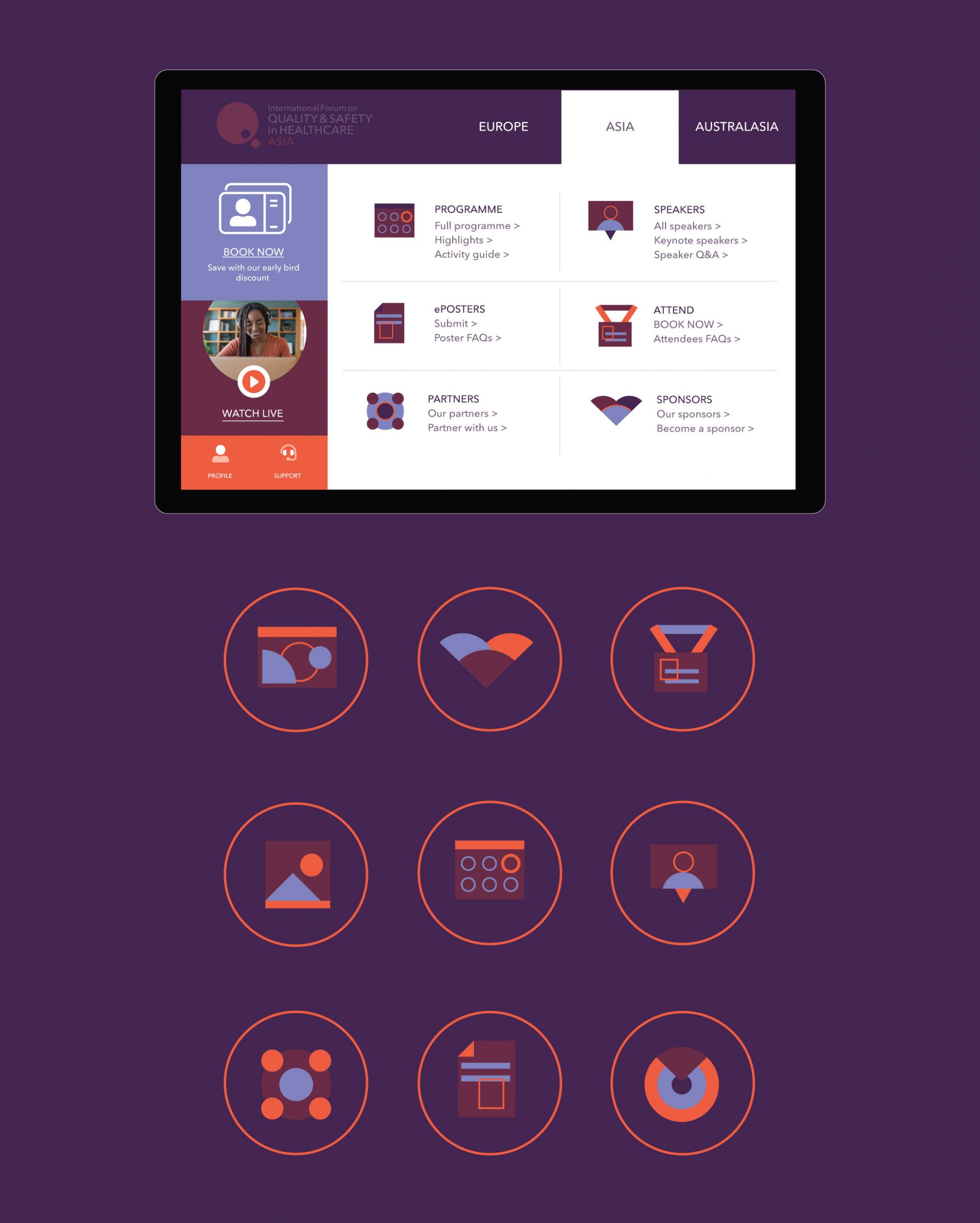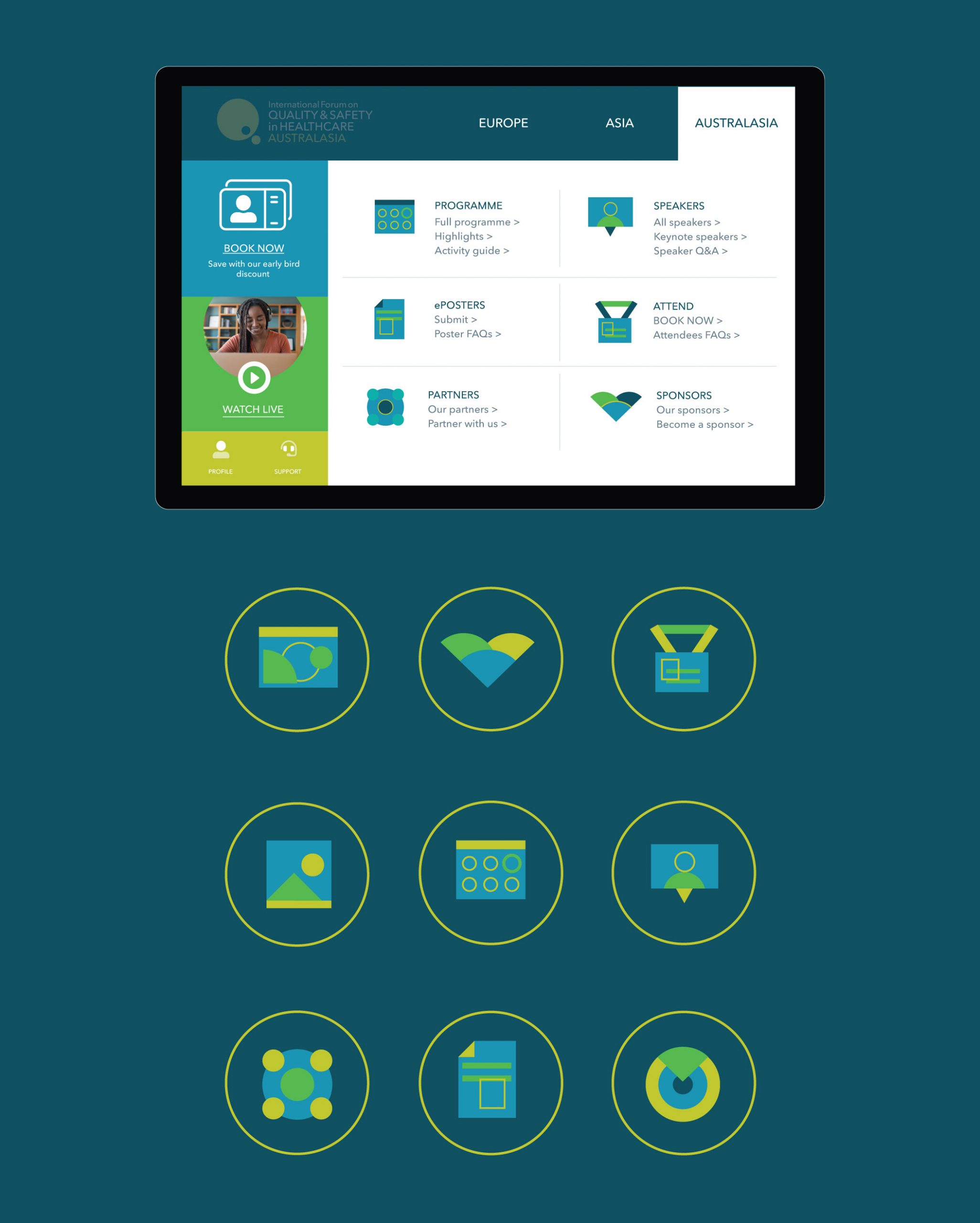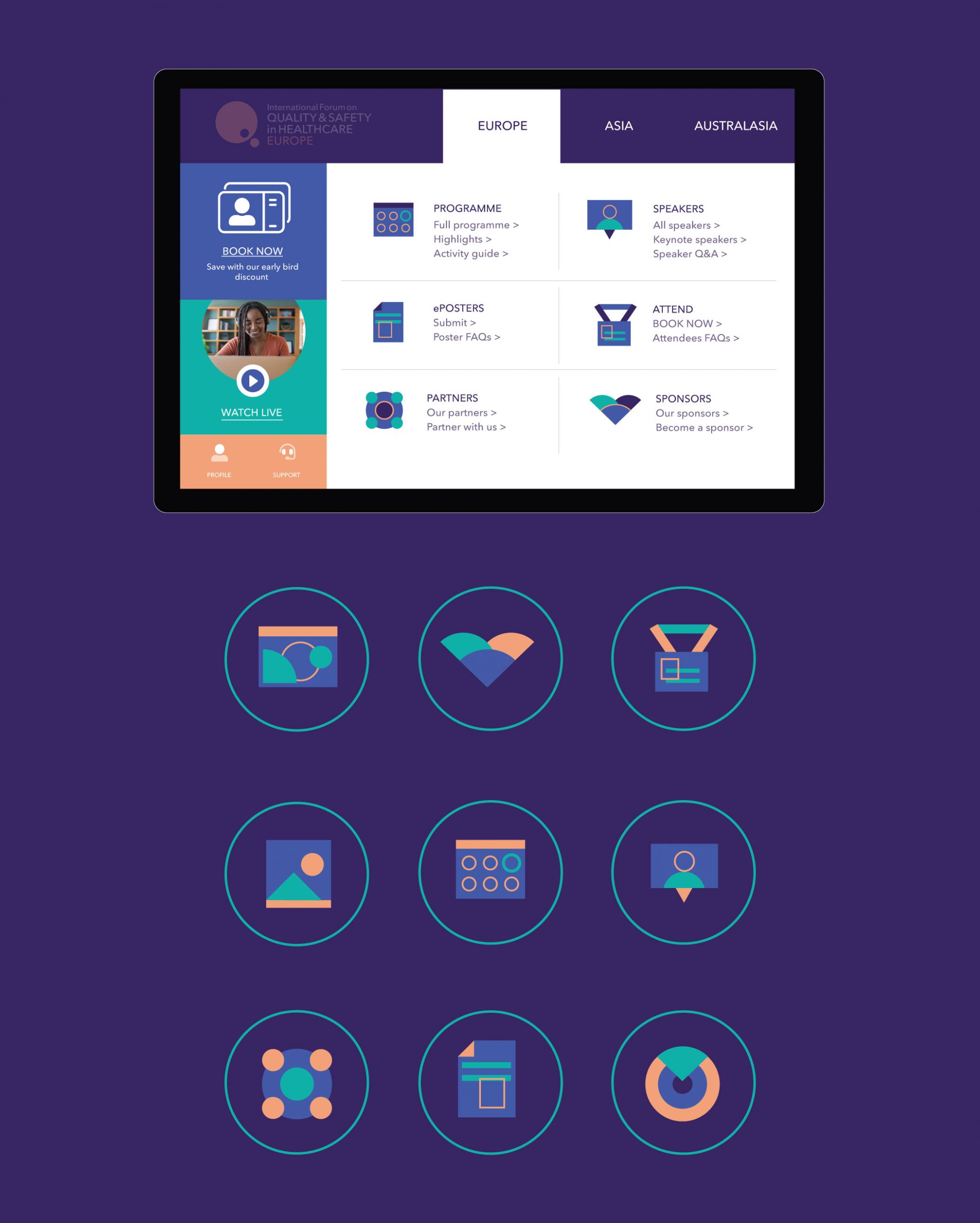 Following on from the refreshed identity and colour scheme. I created a whole suite of graphics and icons which were more flexible for on-screen use and could replace the event photography which was used previously to market the events.