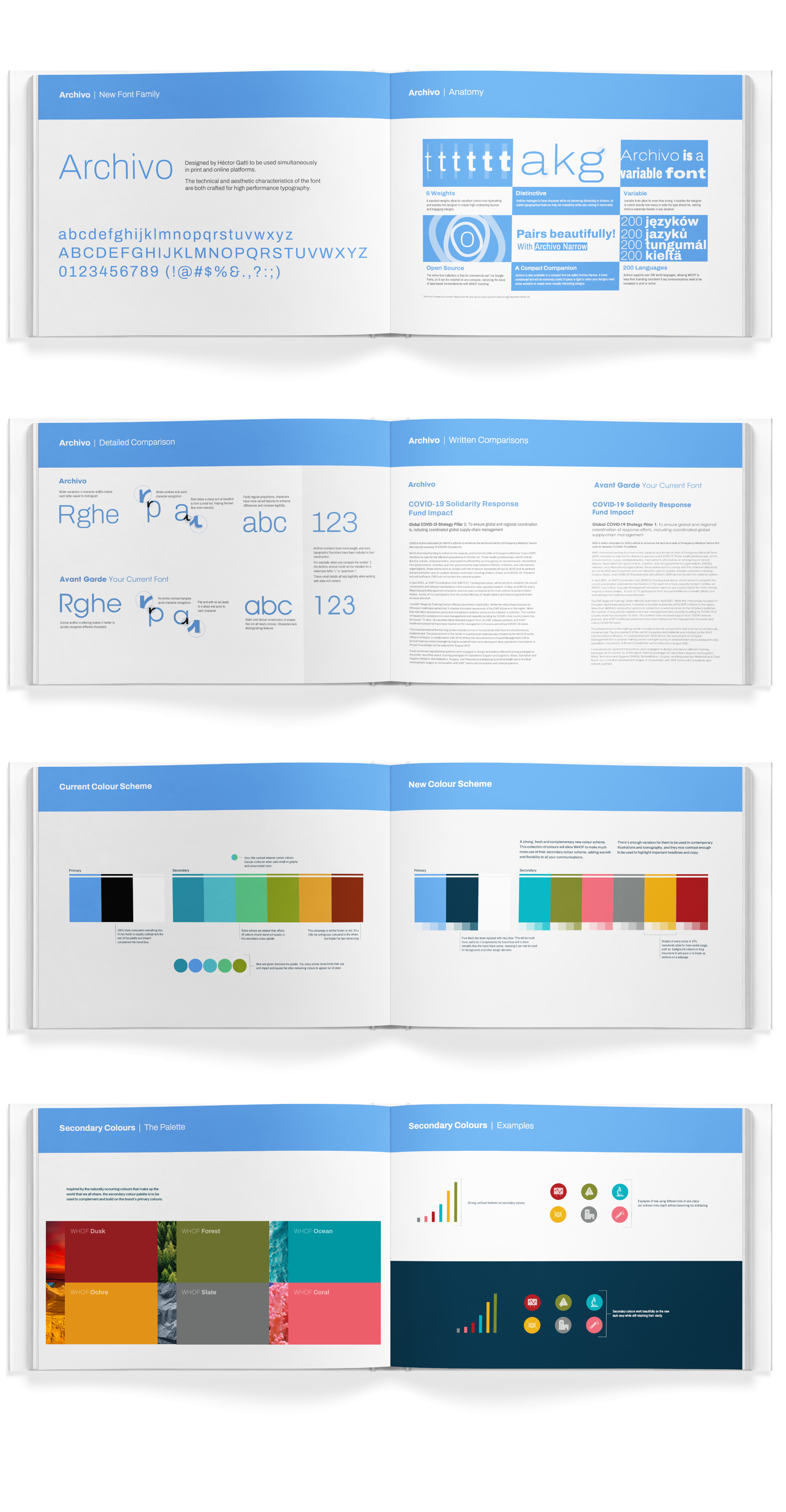 For the typeface, I recommended Archive its varied character widths, significantly improving readability. Additionally, Archive’s extensive language support—covering over 200 languages—ensures consistency in the WHO Foundation’s branding across translated communications.